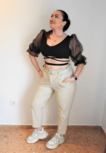 La primera prenda que escogí fue este top negro con las mangas de organza semitransparentes y con dos cintas laterales que se enrollan en la cintura.